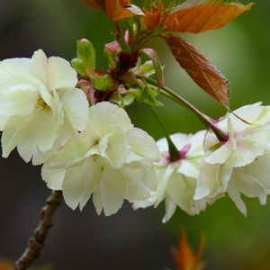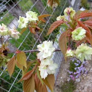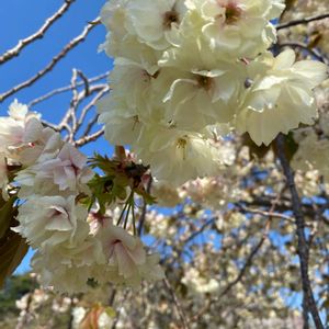 ウコン桜🌸 花弁が香辛料のウコンに似た萌黄色になることからウコン桜と名付けられたそうです。 黄色い花を咲かせる唯一の桜であり、清酒(黄桜)はこの花にちなんだそうです。 咲き続けると白っぽくなり、見分けにくい。 黄色と言うより、薄い黄緑、ギョイコウ桜より色が薄いです。 紅華桜の側で控えめに微笑んでました💚💠🌸
