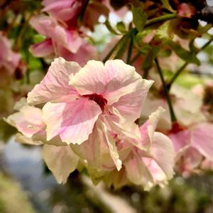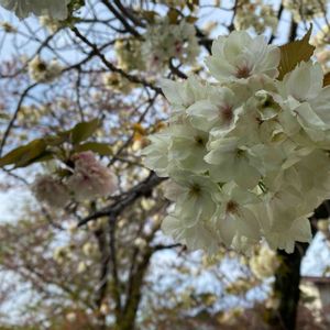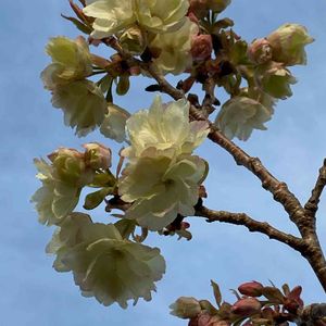 昨日撮影。何これ…桜って緑色に変色するのと青ざめ😨 調べると鬱金(ウコン)という桜だそう。 緑色→白→ピンクの順番で変色するようです。