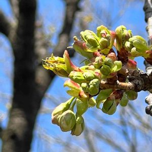 庭の鬱金桜…未だこんな蕾です 今朝花友さんが上げられた桜が鬱金桜か御衣黄かのやり取りがありましたので… これでは参考になりませんし 場所的に上の庭の石で留めた縁から手を伸ばして写してこんなもの…色的にも毎年写すのに苦労させられる桜です