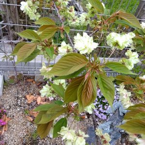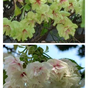 木曜日は木🌿 鬱金桜💚 淡色緑色から色変わり… 赤い花弁へ✨ 御衣黄桜と似ていますが 花弁に濃い緑色が無い事から 区別される事がある様です。