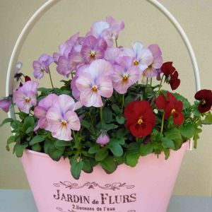 主人に貰ったら花籠を、寄せ植えにしたら5個しか植えられませんでした😰😁💦(私が持上げられる限度😱)