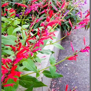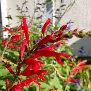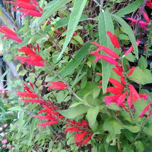 サルビアエレガンスが満開です🌸 我が家には珍しい朱色の花ですが、秋の終わりにはありがたい差し色です😊 葉の色もライムで、ほぼ一年中いい仕事してくれます😁