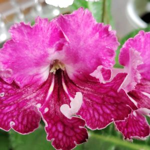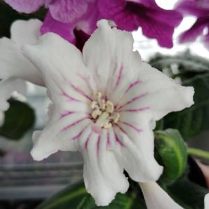 ストレプトカーパス実生苗 シュプールの子どもの中にこんな花が咲きました。 普通の花は花弁5枚のところ6枚、そして上弁2枚には筋が入らない🌸😍 こんな花がずーっと咲いたら面白いよね🥰🤣