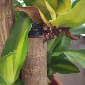 ドラセナ・マッサンゲアナの若い芽が枯れました。 先代マッサンが購入後1ヶ月で枯れ始め、お店に相談したところ病気の可能性があるということで交換してもらった新しい2代目の子です。水のやり方や置場所などのアドバイスももらっていたのですが、2代目のこの子も同じように枯れ始めたのかと思いとても心配です…… 水は土が完全に乾く頃にあげ、購入から20日くらいで今日3回目の水やりでした。置場所はベランダに面した窓際ですが、屋外工事の影響で最近薄暗めです。 2代目のこの子で枯れている芽はこの1ヶ所だけで、新芽は同じ幹からも出てきています(画像下方) 対策はないのでしょうか?この枯れた芽は切らずに放置が良いですか?