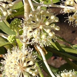 今日のお花 ヤツデ ウコギ科ヤツデ属 常緑低木 本州茨城県以南の太平洋側、四国、九州、沖縄に分布。 主に暖地の海岸近くの山林などに自生する。 庭や庭園にもよく植えられている。 和名のヤツデは葉が掌状に深い切れ込みがあることに由来し、実際には8つに切れ込んで9枚に裂けているものが多いが、「八手」の八は数が多いという意味がある。 別名はヤツデノキ、オニノユビ、テングノハウチワ 葉は20cm以上もある大きな葉で、長い葉柄をつけて互生、あるいは輪生する。 形は文字通り、掌状物が7.9.11の奇数に深く裂ける。 花期10〜12月 茎の先に球状の散房花序が集まって大きな円錐花序を作る。 花は直径5cmほどの5弁花で白く、両性花または雄花と雌花があり、枝先に丸まって付く。花びらは小さく反り返り、花茎を含めて黄白色でよく目立つ。