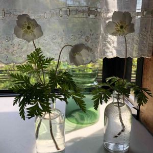 イチリンソウのお花を朝日が差し込むキッチンの窓辺に飾りました 後ろのレースのカフェカーテンと同じぐらい真っ白な花びらで お花がわかりづらいですね