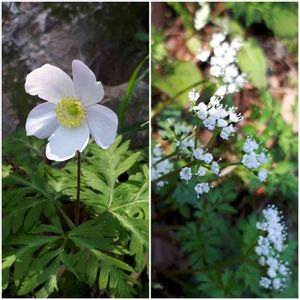 ハイキング途中で。 川沿いの花です。 イチリンソウは咲き始め。 ヤブニンジンは自信なし😅 セリ科のお花は難しいですね。 追記:なるさんにセントウソウと教えていただきました。ありがとうございます😌