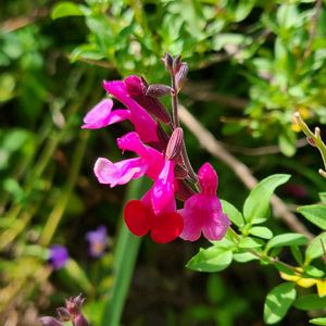 【アキノベニバナサルビア】《シソ科》 またまたツインズ チェリーセージ🍒と似ている。 チェリーセージはもともとサルビア・ミクロフィラのことであって、 それは花冠の内側の基部に突起があり葉がざらつく点がアキノベニバナサルビアと異なるという説があるが、 両者の区別は少し見ただけではよくわからない。