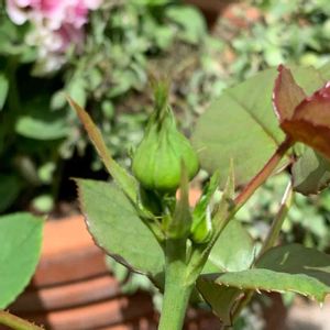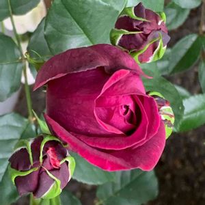 アストリットグレーフィンフォンハンデンベルグの蕾が小さいのを入れて4つも見つけました❣️赤黒の見事な薔薇です。咲くのがとても楽しみ❣️