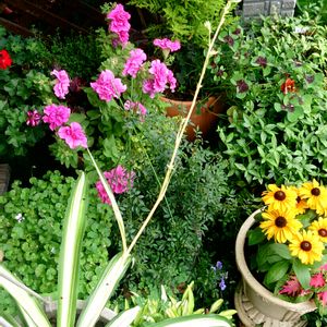 斑入りのオリヅルランが涼しげ。ケイトウとニチニチソウとホウセンカ、それにタイタンビカス 鉢植えの中でどこまで変化するのか楽しみです。