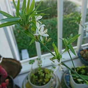 オリヅルランの花が開花しましたよ🎵ランナーの先に、ちょこんと可愛らしい小さい花が😍