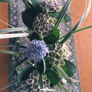 おはようございます 蒸し暑い朝になりました。 3本生けてた 紫陽花が… 変わりにオリヅルランの葉をプラス🌿 この時期 水を使ったものは傷みやすい 😢
