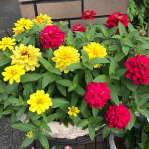 ❤️ジニア💛 後ろには冬の寄せ植えの 名残り花が入っています💦 ジニア2本で上手くカバーして くれました(^^)