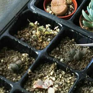 先日、隔離病棟組扱いになったリトープスさん。 見た目元気そうだけど。 我慢してたのかな?ごめんね 追記 この中から色変りが出ました。 抹茶玉とタグつけてあります。