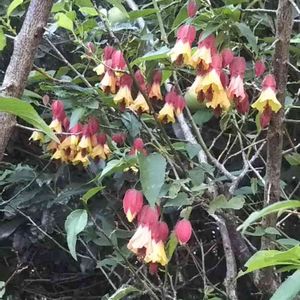 庭に咲いている花。何て言う名前なんでしょうか?梅の木にツルが絡まっているようにも見える。花はベルの様な形をして、とても可愛い。 知ってらっしゃる方、宜しくお願いします(^.^)
