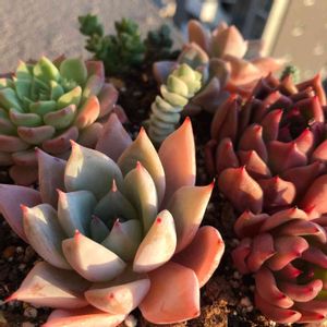 パクさん苗寄せ💕 今回は 寄せ植えしたかったので お手頃価格の苗を選びました😁 このお値段1300円‼️ はじめた頃には ゲェーーーー高い〜〜と思っていたはずなのに 今では お手頃価格と言ってしまう自分が怖いです😁 赤い子 色白ピンクの子 黄緑の子 見えない所にピンクパイちゃんがいます♡ 名前も可愛いですし、ピンクローズの小型みたいな子かな❓と勝手に思い 連れ帰りました😍 すかすかに寄せてるので 真上からはお見せできません(° o°)! ぷっ( ´艸`)