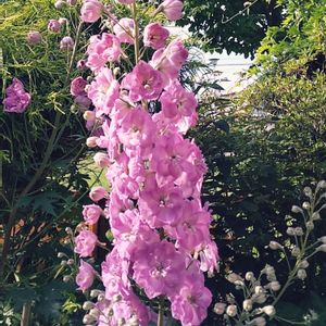 今年のデルフィニウムはすごい花数です おおよそ1.5メートル程に延びて、花数の重さで倒れてしまうので、棒にくくりつけております‼️