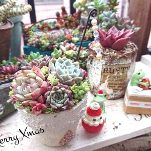 こんばんは😃🌃 またまた買っちゃいました🎵😍🎵インスタでKOHさんのX'mas鉢凄い素敵なリメ鉢です😌💓 X'mas鉢何だけど手にした瞬間何だか私的には😃✌️結婚式のイメージが目に浮かびました😅 うん十年前のチャペルでの結婚式を思い出し😃💡 ♀_(`O`)♪あの頃は♪若かった😅 なんて思ってしまった私です 今日の私は素敵なリメ鉢にテンション上がりまくりでちょっと変かも😁😃🎶 多肉は近くのホームセンターで買って来ました😆でもだんだんと多肉売り場か狭くなってきて数も少なくなってちょっぴり寂しく感じました🍀 今日も1日お疲れ様でした🍀
