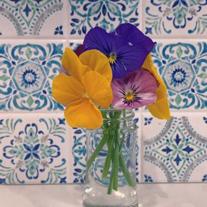 先日寄せ植えしたビオラ✨ 株を大きくしたいので、やむなく摘花… でも、お花は元気なので💕 いつものラー油のビンに生けました。 少しの間ですが、キッチンが華やかになります。