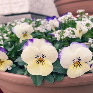 わが家のビオラ✨ やっとこっちを向いてくれました😃 アリッサムのあまい香りが、春を待ち遠しくさせます。 鉢の中にはお楽しみが… なに色が咲くかなぁ🌷🌷🌷