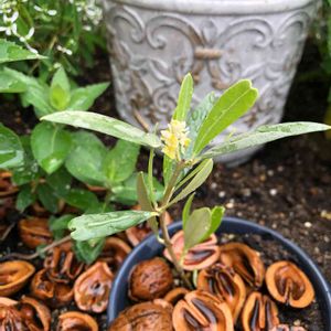 小さく育てるオリーブツリー🌲シリーズのマンザニロ太木挿しツリーにも花が咲きました🤗 実がなると嬉しいので他の開花株の下に置きました。黄色い花粉が葉っぱにも降り掛かっています。 小さなツリーたちは既に花粉祭り状態です。