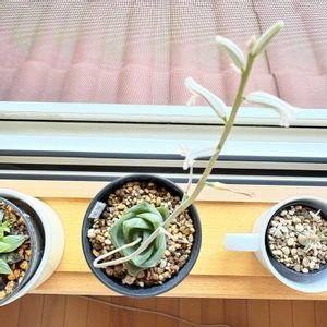 コンバンミ〜🙏 水無月(3日)月曜日(☀晴れ) 今日も暑かった~😱😵😰 又今朝地震が有りましたが~大丈夫でしたか~⁇⁇ ホンマに~ビックリされた事と思います~どうか〜ご無事で~🙏🙏🙏 さて~今日は珍しい多肉植物と言う事で~⁇⁇ ①…我が家のハオルチア…   錦は解るのですが… 多分で~🏷付けしてますが~お詳しい方~間違ってましたら…教えて下さいネ~ 娘の職場の上司に〜母の誕生日にって〜頂きました~ 有難うございました〜高そうな~ハオルチア錦を… ②…これも〜何年前かな~   2年に成るのかな~⁇ 娘が~戴いた物〜上司様々デス~ホンマに〜有難うございました〜🙏🙏🙏 ハオルチア五重塔 ③…ハオルチアのお花💐   は只今〜十二の巻が~ 咲いてマス〜咲いてるのを 集合させて〜ハイ🤳📱パシャリ〜暗く成ってからの🤳📱なので~いつもの色味では無い🦆デスが~悪しからず〜 それと〜「毎月3日は耳の日」に参加させて下さいネ~🙏🙏🙏 その耳で~黒兎耳(クロトジ 何か~色味が~悪いので〜根詰まりしてる🦆〜又植え替えしないと~ネ~⁇⁇ ④…十二の巻のお花💐の〜   アップップ〜 ハオルチアはみんなこんなお花💐デスよネ~地味〜な~(笑)(笑)(笑) ちっちゃいお花💐だから~ムズいけど~⁇⁇  ⑤…鉄砲百合の球根を~あ   げた~ご近所さんにて   🤳📱パシャリ〜今日 🤳📱しました~おっと~日にちが~変わってる〜から〜昨日に成りました~アチャ~😱😵😰😫 百合は〜真っ白だけど~黄色いシベが無いと~百合らしく無いけど~このシベの花粉が~厄介だから~😱😵😰😫 又しても夜分の📮に成ってしまいましたが~どうか一つ〜ヨロシクで~す〜夜分に失礼致しました~オヤスミなさいね~💤