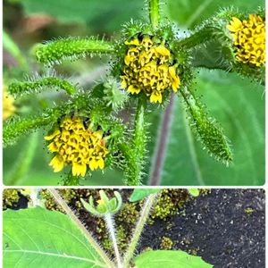 メナモミ 🌱キク科 メナモミ属 ✽高さ60〜120cmになる多年草 ✽黄色の頭花を散房状に多数つける ✽頭花は中心に頭状花、その周りに舌状花が一列に並ぶ ✽総苞片は5個あり、腺毛が密生し粘り、開出するとヒトデのように見える ✽葉は対生し卵形〜卵状三角形で、翼のある長柄がある ✽茎や葉の裏には白く長い開出毛が密生する 花は色違いですがハキダメギクに似ていて3裂しています!💞