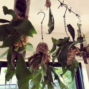 作ったホヤカルノーサと コウモリランの苔玉です。 苔は可愛らしい山苔を 使いました。 ホヤカルノーサの新芽がようやく 動き出しました。