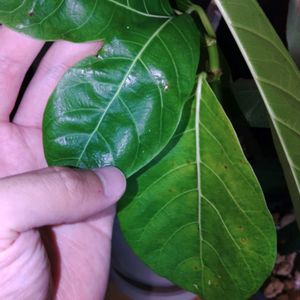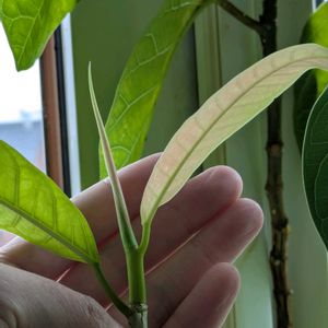 オオバイヌビワの面白い現象。 本来、葉身は楕円形(右下が本来の葉)ですが、二又になってました。 多分、他の枝と交差していたので、葉原基に傷がついてこうなったので突然変異ではないと思います。