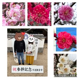娘夫婦に 子供が授かり👶🙌 5ヶ月めの戌の日 不洗観音寺に 安産祈願に行きました🌸 ちょうど梅が満開で とても綺麗でした💖⭐️ やっと ばあばになれる😂 小雨の降る曇り空でした☂️ 4番目の梅の背景は 青空ではなく ブルーシートです😅