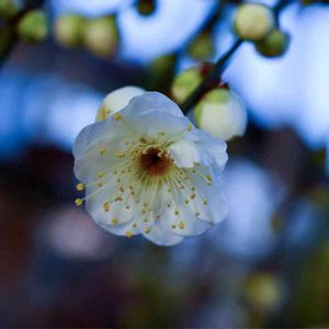 庭の枝垂れ梅が咲き始めました はんなり冬空に透けています
