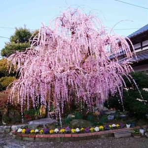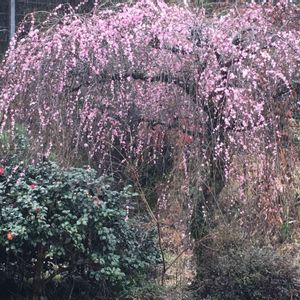 《枝垂れ梅》 御近所さんの素敵な枝垂れ梅です🌸。左側に赤い椿と松もありますよ😃🌟。 我が家の枝垂れ梅は、まだ三分咲きです🙄🌀。枝ぶりも違うんですよ😊🌳。
