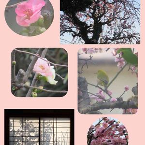 義母宅より 枝垂れ梅とメジロは部屋の中から撮ったのでボヤけてる! ボケも咲き始めました!5輪🌸 障子に影絵♪♪よく見ると洗濯バサミの影も(笑) 緑がかった白からサーモンピンクに🎶 義母宅のボケは本当に綺麗✨