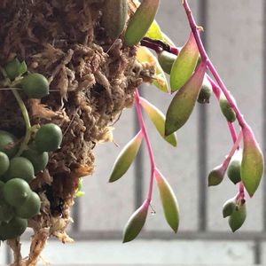 【アーモンドネックレス】 鉢から伸びて地面(コンクリート上の少量の土)に根を張ったド根性さん~(*´□`)ノ 鉢を移動出来なくなるから、今のうちに整理しました🥰 つやつや、ぷりぷりで可愛いね😍