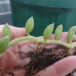 斑入りグリーンネックレス✨ 上から①②③でお願いします☺️ 右側は左の拡大です。 みどりのまとめに慣れてなく😅 見にくいですが,見ていただく方は拡大しながら見てくださいね😉 ①根があるところは土と繋がっていますが、伸びているところは土から浮いているので,その間に赤土を撒きます。 グリネの茎に土が触れていると根が出てきます。 根が出る箇所が多いほどしっかりと根付くのでそれを目指したい! ②このくらいパラパラと。可愛い粒が見えなくなると思ってしまいますが, ③上から水をかけると 赤土が間に入り込み、粒が顔を出し 茎にふわっと土がかぶさります。 こうするとあちこちから根が出てきます🌱🌱🌱