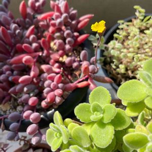 ルビーネックレスに花が咲きました☺️ 周りにいるリトルミッシー、アロマティカス、カリシアは全部オマケ。 短いカット苗数本から増えました。 さすがオマケになるだけあって、強い!