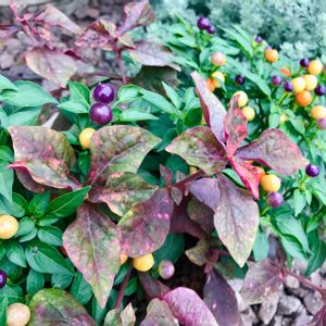 9月23日に投稿したトウガラシのプチ寄せ植え🌶 日向に置いておいたらこんなに色が変わりました💜🧡💛 グリーン×イエローだったアルテルナンテラはオレンジ×レッドに🍁 パープル一色だったトウガラシの実はイエローとオレンジに変わり、賑やかで可愛い〜(๑˃̵ᴗ˂̵) 奥のシルバーリーフはウエストリンギア スモーキーです🌿