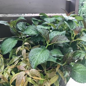 ハイドランジア ブラックダイヤモンド ダークエンジェルパープル✨ 長いお名前のアジサイです^^ 雨の日のダークリーフが美しい🥰 左下のニュアンスカラーのリーフは西洋イワナンテン ラムライムの新葉です🌿