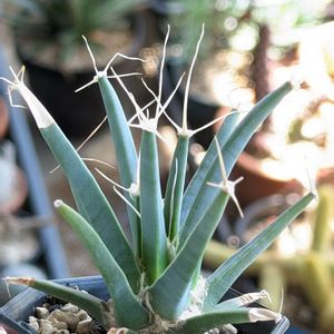 No.3ー3 レウクテンベルギア 晃山 アガベの様にみえますが一属一種のサボテン☝️ サボテンのコブの部分がこの長く伸びた肉厚の葉 そして先端からピロピロ~と伸びたのが刺、簡単に折れるので要注意❗ 今はまだチビ苗ですが成熟すると土の中から塊根がせり出て幹立ちになると言う🤗 夏には黄色い花もシュッパっと咲くそうで。。。。 何から何まで楽しみの一鉢 今回、教えていただいたお店に行った目的は「晃山」だったのです やっと巡り会えたァ~⤴️⤴️感涙にむせぶ😢 ありがと~🙋 藍結ばぁばさ~ん