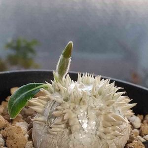 パキポディウム プレビカウレ 恵比寿笑 葉っぱが全部落ちて休眠か❓️。。。。っと 思いきやニョキっと何かが( *´艸)出てきた これは☝️いったい何だろう~❓️ 葉っぱ。。。。かな🤔 始めての冬越え ワクワクドキドキです🤗 H3cm W3cm