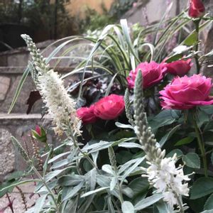 トウテイランの満開を待っていたら、開花スピードは遅いのに下花からどんどん茶色く枯れてしまうぅー😱 ベロニカ系縦長穂花の宿命なの?🤔 左下にはアンテルナンテラの花穂が伸びてきてます♪ 後ろの細長い🌿去年から居ますが名前が分かりませーん😅