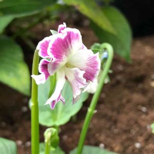 ぞうさんビオラ? クルッと下にカールした花弁が垂れたぞうさんの鼻を思わせ、また種を付けないので長く花を楽しめるからだそうです。