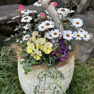 ①主人が昨夜、また花束をもらって帰って来てくれたので、庭の花を足して私好みにしちゃいました😁 ②定年退職する主人にくださった華やかな花束です。くださった方々に感謝です💕そして、もちろん長い間家族のために頑張ってくれた主人にも感謝感謝です。 ③マラコイデスが花壇で揺れていて、これをアレンジに入れると可愛いんです😍 ④狭い庭をワイヤーバスケットを使って二段活用しています。 ニゲラの新芽🌱の上にロベリアの鉢を日光浴。 ⑤ホームセンターに寄ったら八重咲きマーガレットに遭遇。やっぱり好きなので、お連れしちゃいました。置く場所無いので、ベンチの上です😅