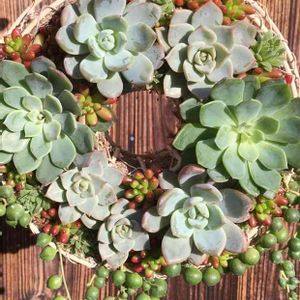 多肉リース。溶けてボロボロになったから全く新しいリースにしてみた!予想してたのと出来上がりが違ったけどま、いっか!なかなかうまくいかないなぁ〜(*´Д`*)