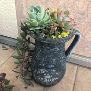 水差し型の器をいただいたので、寄せ植えました。 左に、トリメンシス。 右は、プレリンゼをメインに、ルビーネックレスを垂らしました。