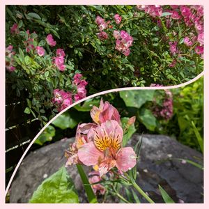 優しい色合いのブルームーン( ˶’ᵕ’˶ )💕 これも一番花ですが、遅れたせいか、葉も薄い色で花はピンクぃ感じ。優しく咲きました。 ②安曇野のなんちゃってアーチ。まぁまぁかな。枝先が樋を上がって行き、もはやuncontrollable😱 ③ようやくビクター君に5枚花弁が生まれ出しました。生き残っているモーヴァンとのコラボ、なるか🥰