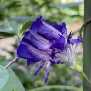 今朝庭・サファイアの風 鉢植えあんどん仕立てが上手く行かず、途中、地植えに変更しました。 土の問題かと思っていたのですが、、。 どうやら,場所の問題だったようで 鉢を置いていたところに勝手口のライトが当たっていて、夜間の照明が原因だったようです。 朝顔って、夜に成長して朝開花するんですね。 一輪だけでも無事出会えてよかったです。 とても綺麗です✨