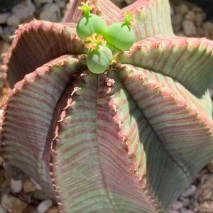 《ユーフォルビア カメレオンヘルメット》 サボテン🌵のオペサに似た姿。色もしっかりとしています。子株もふえるらしい… それにしてもユニークな名前です! ヾ(*>∀︎<)ノ゙キャハハッ