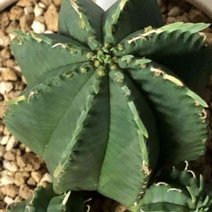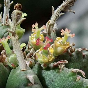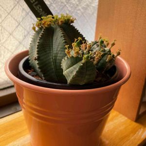 小さな花に更に小さな花が咲きました🌼 寒い冬の間、窓辺で管理していたら 日照不足でか徒長して?縦長に姿を変えた カメレオンヘルメットの頂上辺りは 春たけなわです🌸 ユーフォルビア カメレオンヘルメット