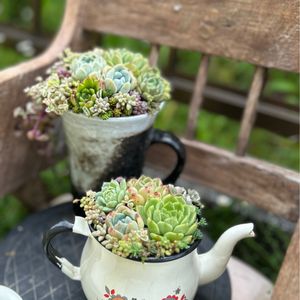 今日は、風も穏やかで庭で多肉事 多肉植え替え、チマチマ寄せ植えチマチマ寄せ植えの器は茶器です 今年の冬は多肉にとって可愛そうに随分☆になって仕舞い😔💧 るるかまぼこ板で繋がるのかまぼこ板のお返しに炊飯器、ポット🎁 炊飯器に虹の花をINしました しゃもじが米粒まて付いてリアルだよ🍚 ペットボトルの🐰可愛い 繋がりに感謝です🙏
